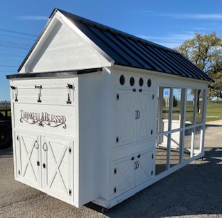 Our  quality, Texas chicken coops are skillfully designed and handcrafted one coop at a time as pre-ordered by our customers.   We carry no inventory or any diy kits, every  house is designed and handcrafted for each pre-order customers dream chicken coop in mind. duck ,bird coop or pet house as pre-ordered,  No Cheap or mass produced coop in a box here. Our coops are built like a tiny home, made of quality materials and hardware.  Some coops weight over 1000lbs upto 1500lbs.. Our coops can standup to most of our Texas weather.